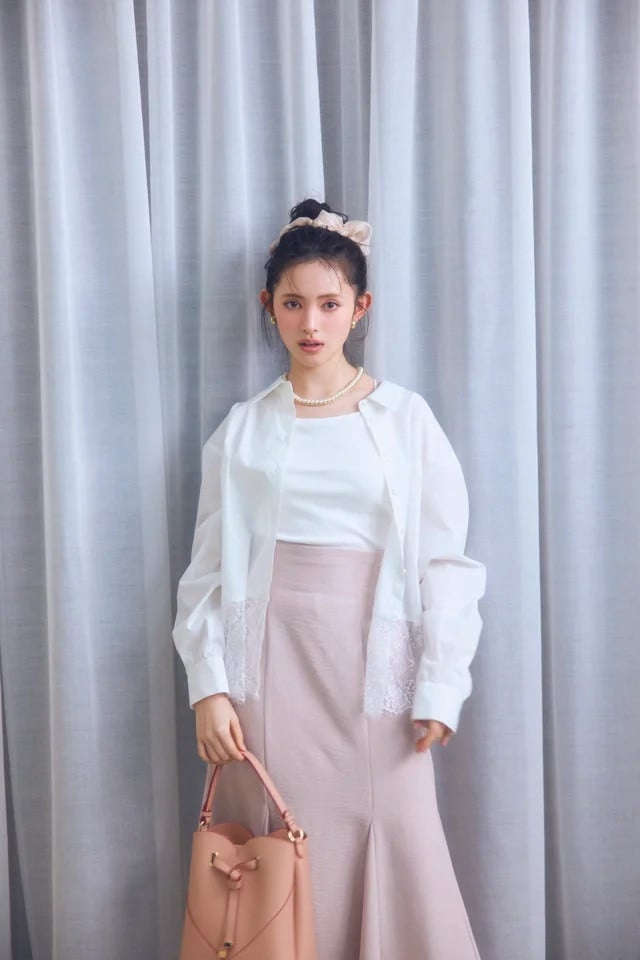 菅田愛貴:裾レースドッキングシャツ/カップ付きアメスリキャミソール/着丈が選べる/美easyリネンライクマーメイドスカート/【2WAY】ハートカットバッグ