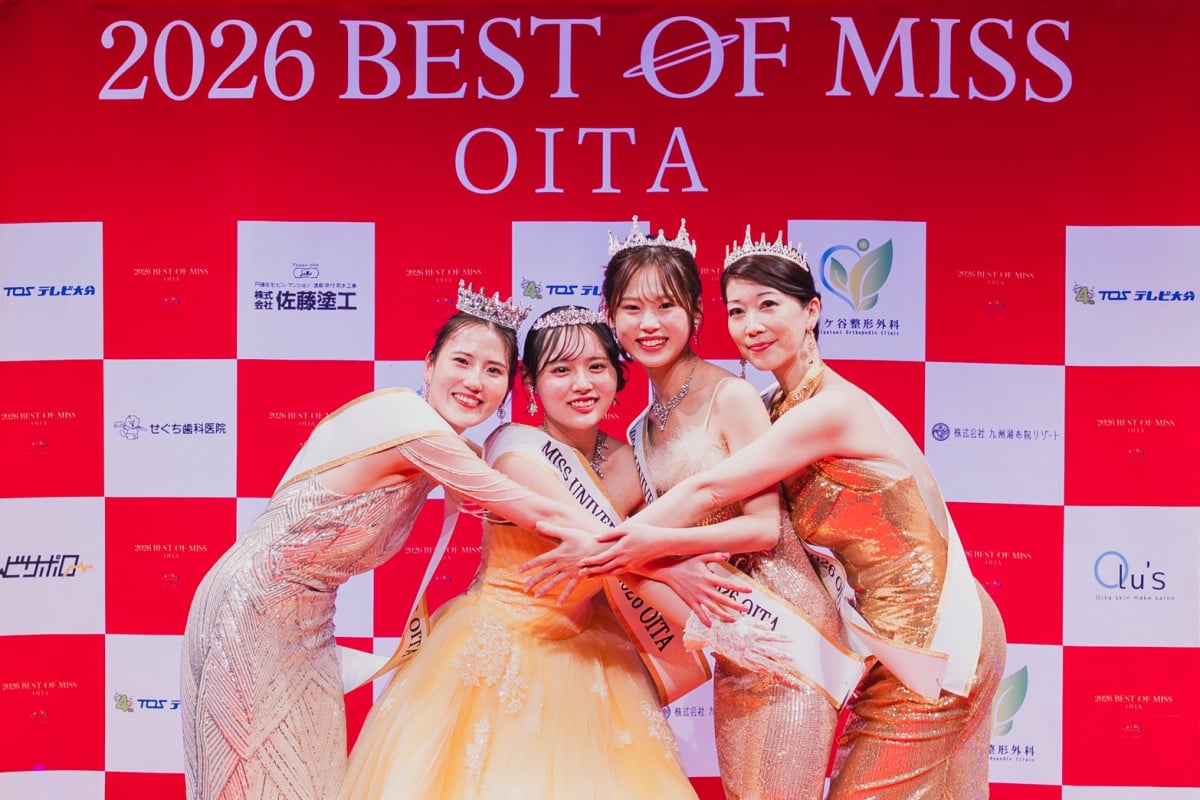 ベストオブミス大分大会の受賞者(左から)「ミスプラネットジャパン2026大分」宮津華香さん、「ミスユニバーシティ2026大分」牧 莉彩子さん、「ミスユニバースジャパン2026大分」佐藤志音さん、「ミセスSDGsジャパン2026大分」松崎恵子さん