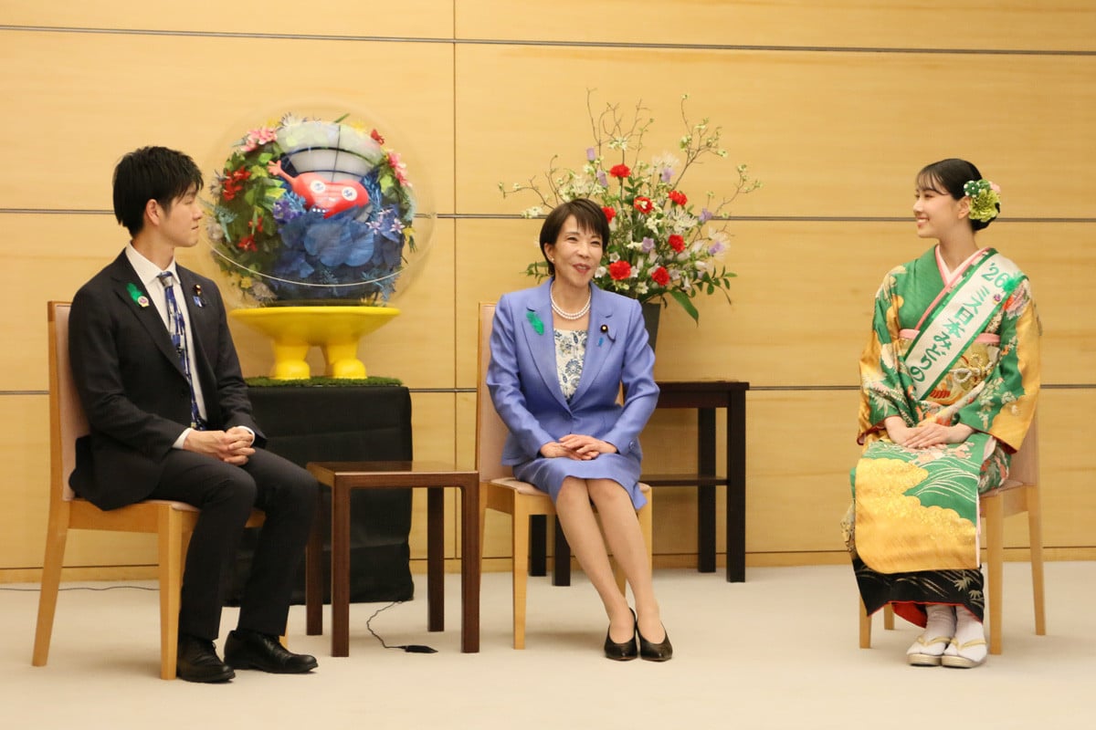緑の羽根着用キャンペーンのPRでミス日本みどりの大使・永田愛実が高市早苗総理大臣を訪問した様子